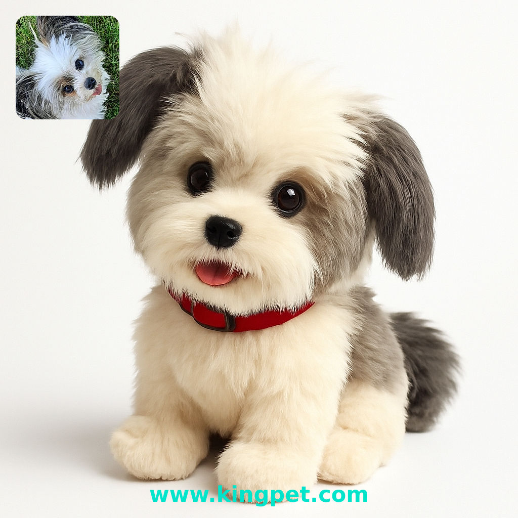 • A fluffy, adorable dog with big, shiny eyes and a little tongue sticking out, looking up with curiosity and joy, surrounded by green grass on a sunny day.